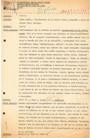 "Continuaremos hoy la lectura de nuestra Enciclopedia de la música negra. Para ello hemos escogido una papeleta de dimensiones desmesuradas. Por su singular trascendencia, bien podría ocupar todo el lapso a través del cual se ha extendido y continuará este ciclo radiofónico. Reza; "Afroamericana, música". De esta ficha haremos un escueto resumen. Desde los albores del siglo dieciséis comienzan a llegar al Nuevo Mundo los navíos negreros, o "navíos fantasmas", como los denomina el gran bardo brasileño Castro Alves, vibrante autor de "Los esclavos", "Canto de Bug-Jargal", "Voces de África", "Saludo a Palmares" y tantas otras páginas de estremecido fervor antiesclavista. Con sistemática y creciente frecuencia, depositan su trágica mercancía humana, en puertos americanos que van desde Jamestown, en las costas de Virginia, Estados Unidos, hasta Buenos Aires y Montevideo. La finalidad última de los desdichados siervos es el trabajo. Es el duro e infrahumano trabajo esclavo, en reemplazo del indio, quien no rinde, pues su cultura está colocada en un hito anterior del de las culturas africanas o euroamericanas, y por causa de que su físico no tolera las altas temperaturas, bajo el implacable sol tropical, ni las pesadas faenas en minas, ingenio y trapiches."