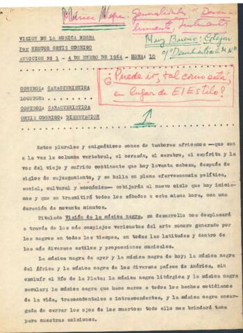 El texto mecanografiado que presenta el PDF, es un guion para el primer programa radial con este título. Emisión del día 4 de enero de 1964. Tiene nota manuscrita en tinta rosa y otra en verde.