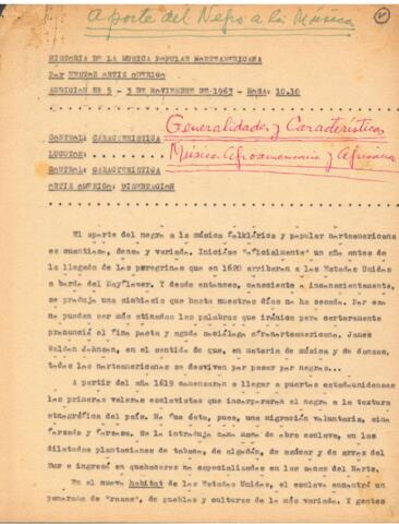El PDF muestra el texto mecanografiado del guion para una emisión de un programa radial emitido el 3 de noviembre de 1963 a las 10:10hs. Tiene en el encabezado, una nota manuscrita: "Aporte del negro a la música" y otra, debajo del título: "Generalidades y características Música afroamericana y Africana."