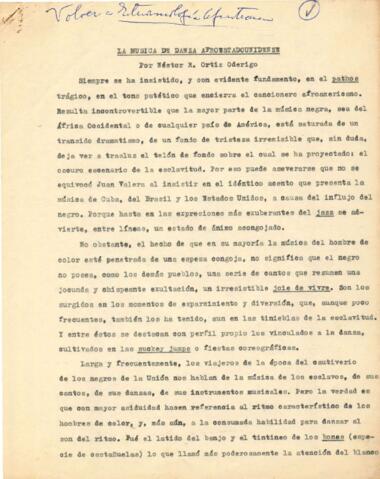 La transcripción del documento es la siguiente: "Siempre se ha insistido, y con evidente fundamento, en el pathos trágico, en el tono patético que encierra el cancionero afroamericano. Resulta incontrovertible que la mayor parte de la música negra, sea del África Occidental o de cualquier país de América, está saturada de un transido dramatismo, de un fondo de tristeza irremisible que, sin duda, deja ver a trasluz el telón de fondo sobre el cual se ha proyectado: el oscuro escenario de la esclavitud. Por eso puede aseverarse que no se equivocó Juan Valera al insistir en el idéntico acento que presenta la música de Cuba, del Brasil y los Estados Unidos, a causa del influjo del negro. Porque hasta en las expresiones más exuberantes del jazz se advierte, entre líneas, un estado de ánimo acongojado.
