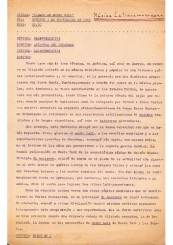 "Desde hace más de tres décadas, en América, así como en Europa, se observa un dilatado interés en la música folklórica y popular de los diversos países latinoamericanos y, en especial, en la generada por los distintos grupos negros del Nuevo Mundo. Particularmente a través del cauce de la música popular, esta tendencia se viene manifestando en los Estados Unidos, de manera cada vez más pronunciada, desde fines de la primera década del siglo que corre, cuando parejas de bailarines como la integrada por Vernon e Irene Castle -a quienes secundaba la orquesta afronorteamericana de James Reese Europe- no titubearon en introducir en sus repertorios estilizaciones de maxixes brasileños y de tangos argentinos, así como de habaneras afrocubanas.